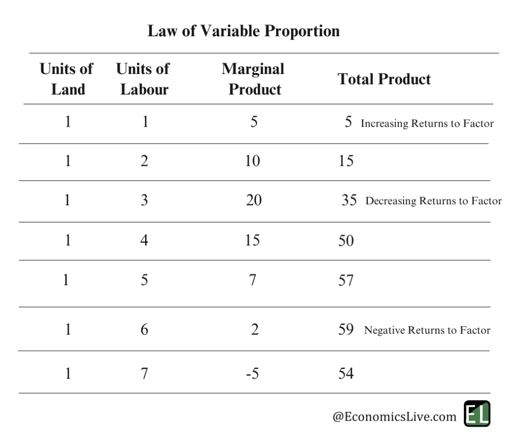 अतः, हम देखते हैं कि जैसे ही उत्पादक ने श्रम इनपुट को बढ़ाना जारी रखा, प्रारंभ में तीसरे श्रम इनपुट तक सीमांत उत्पाद बढ़ा, फिर तीसरी इकाई के बाद यह घटने लगा और छठी श्रम इकाई के बाद नकारात्मक हो गया, जिससे कारक पर नकारात्मक प्रतिफल उत्पन्न हुआ।